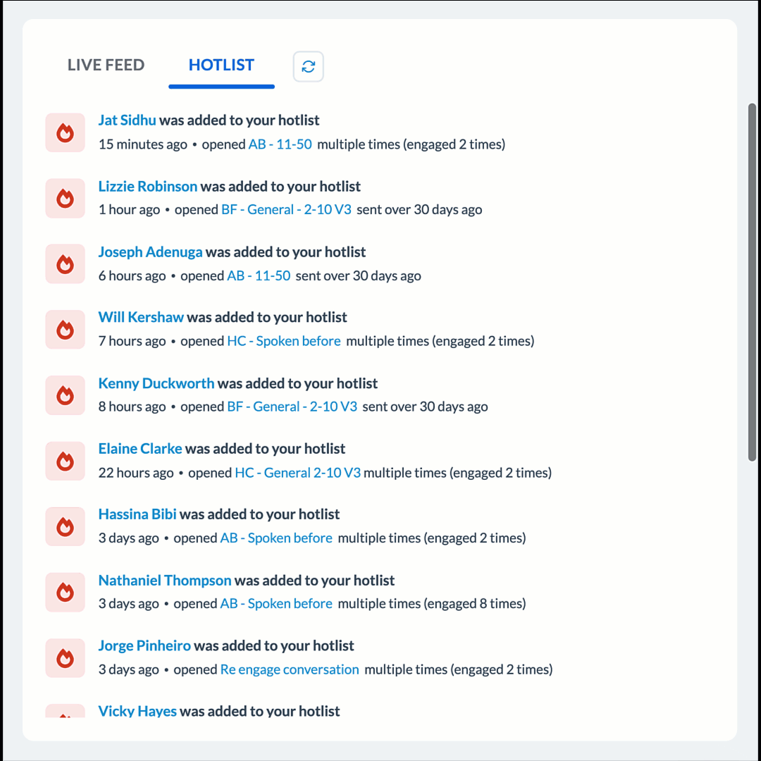 In recruitment, timing is everything. Hotlist analyses how contacts interact with your outreach and highlights the ones most likely to respond, helping recruiters prioritise follow-ups and book more meetings.